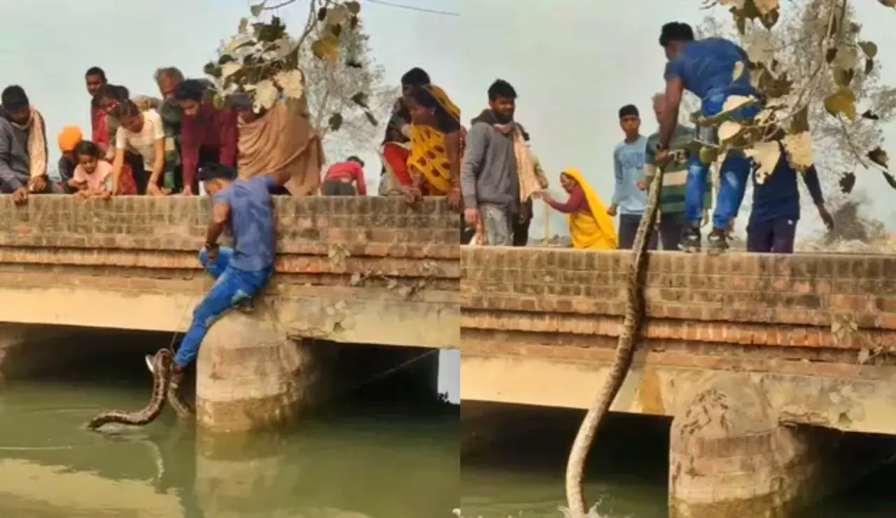 আর সেই মুহূর্তেই দেখা যায় একটি তরুণকে যে ব্রিজের উপর থেকে সেতুর রেলিংয়ে নেমে আসে। এরপর নেমে পড়ে একটি আঁকশি নিয়ে। এবার আঁকশি দিয়ে প্রথমে সাপের লেজ টেনে তোলে জল থেকে। একটু নাগাল পেলেই পা দিয়ে অজগরটির লেজ ধরে টানতে থাকে উপরের দিকে। এরপর হাত দিয়ে পুরো সাপটিকে জল থেকে তুলে ব্রিজের ওপরে নিয়ে এসে ফেলে। সাপের বিশালাকার দেখে ভোঁ ভা ব্রিজের উপরে দাঁড়িয়ে থাকা মানুষজন।